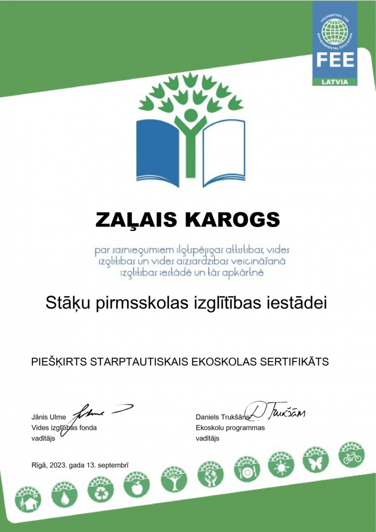Stāķu pirmsskolas izglītības iestādei - Starptautiskais Zaļais karogs 2023./2024. mācību gadam.