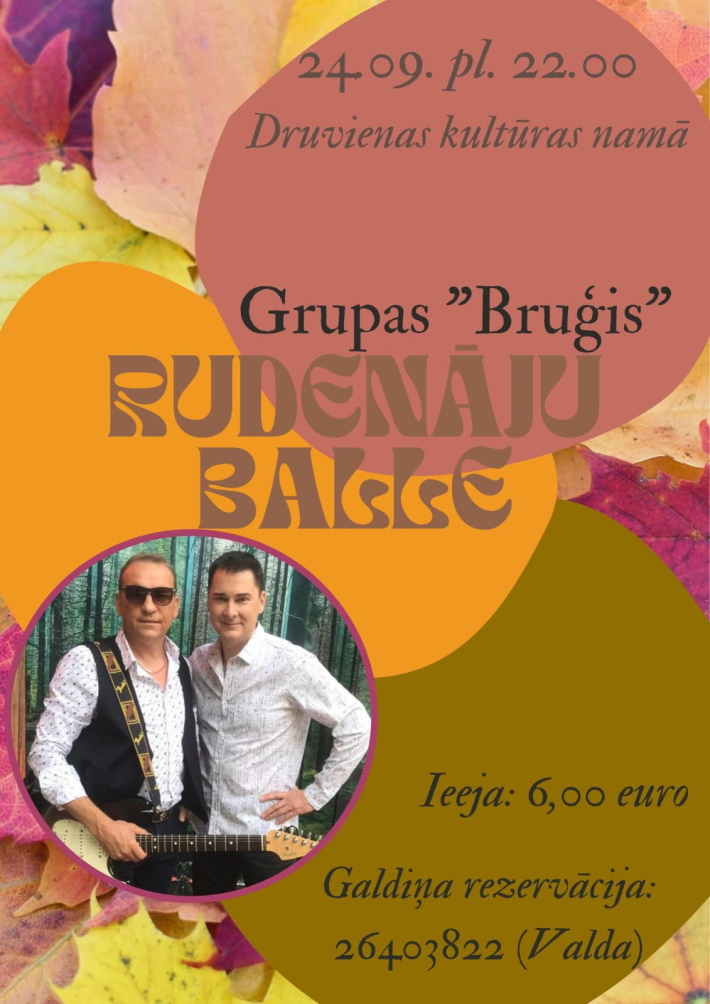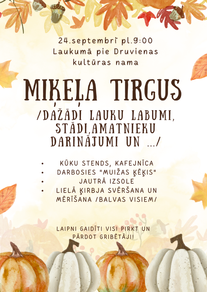 - 24. septembrī Druvienā 9:00 Miķeļdienas tirgus, 22:00 balle, spēlēs "Bruģis" (ieeja 6 EUR).