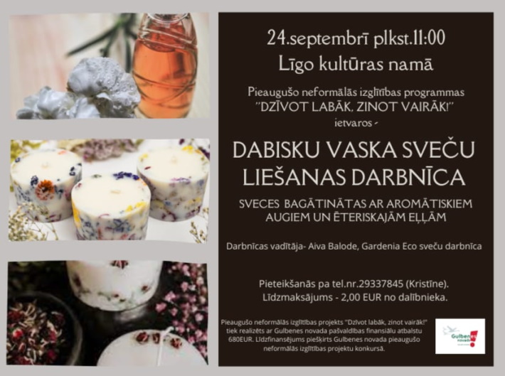 - 24. septembrī 11:00 Līgo kultūras namā darbnīca - dabisko vaska sveču liešana. Pieteikšanās: 29337845 (Kristīne). Dalības maksa 2 EUR.