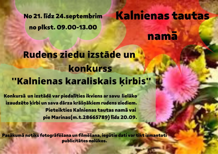 - 23.-24. septembrī 9:00-13:00 Kalnienas tautas namā Rudens ziedu izstāde un konkurss "Kalnienas karaliskais ķirbis”.