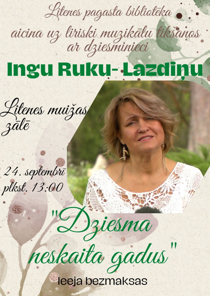 - 24. septembrī 13:00 Litenes muižas zālē liriski muzikāla tikšanās ar dzejnieci Ingu Ruku Lazdiņu. Ieeja bez maksas.
