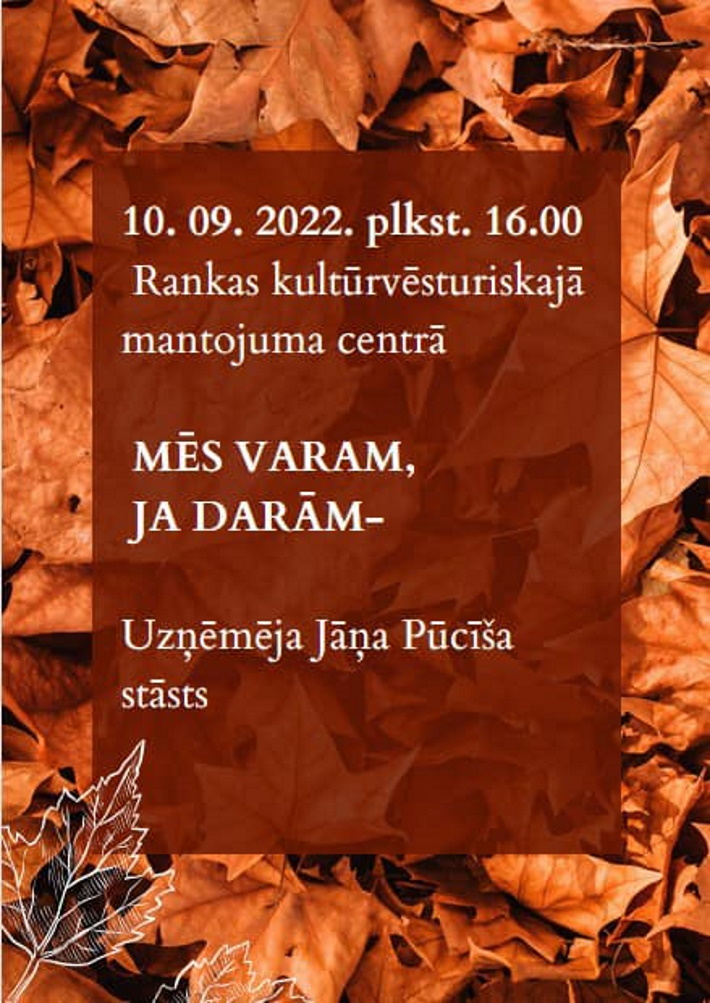 - 10. septembrī 16:00 Rankā tematisks pasākums "Mēs varam, ja darām" - uzņēmēja Jāņa Pūcīša stāsts.