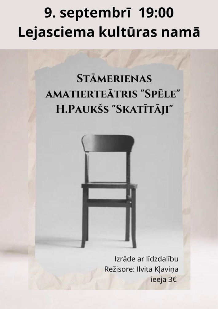 - 9. septembrī 19:00 Lejasciema kultūras namā Stāmerienas amatierteātra “Spēle” viesizrāde - H.Paukšs “Skatītāji”. Ieeja 3 EUR.