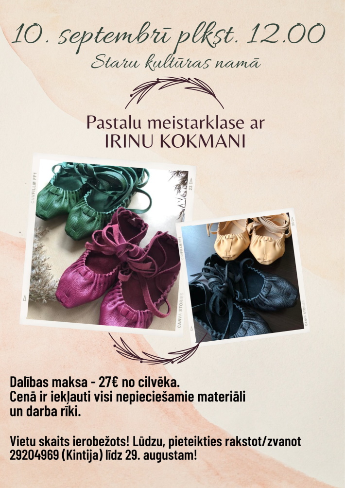 - 10. septembrī Staru kultūras namā 12:00 Pastalu meistarklase ar Irinu Kokmani. Obligāta pieteikšanās: +371 29204969 (Kintija). Dalības maksa: 27 EUR.