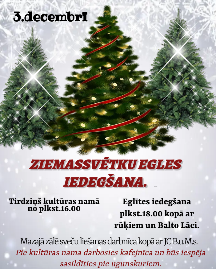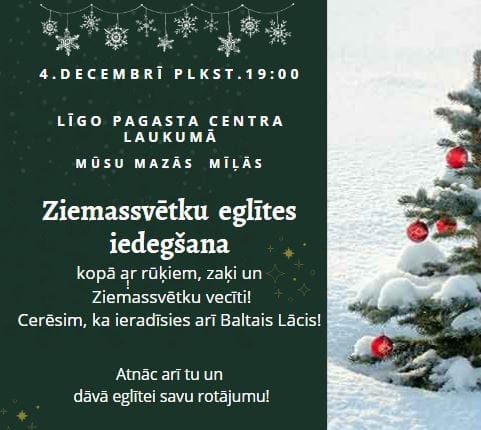 19:00 Līgo pagasta centra laukumā eglītes iedegšana ar rūķiem, zaķi un Ziemassvētku vecīti.