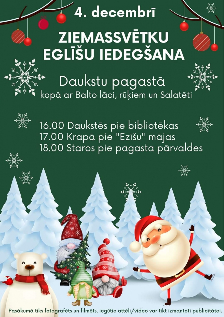 16:00 – 18:00 Ziemassvētku eglīšu iedegšana Daukstu pagasta ciemos kopā Balto lāci, rūķiem un Salatēti. 16:00 Daukstēs pie bibliotēkas, 17:00 Krapā pie "Ezīšu" mājas, 18:00 Staros pie pagasta pārvaldes.