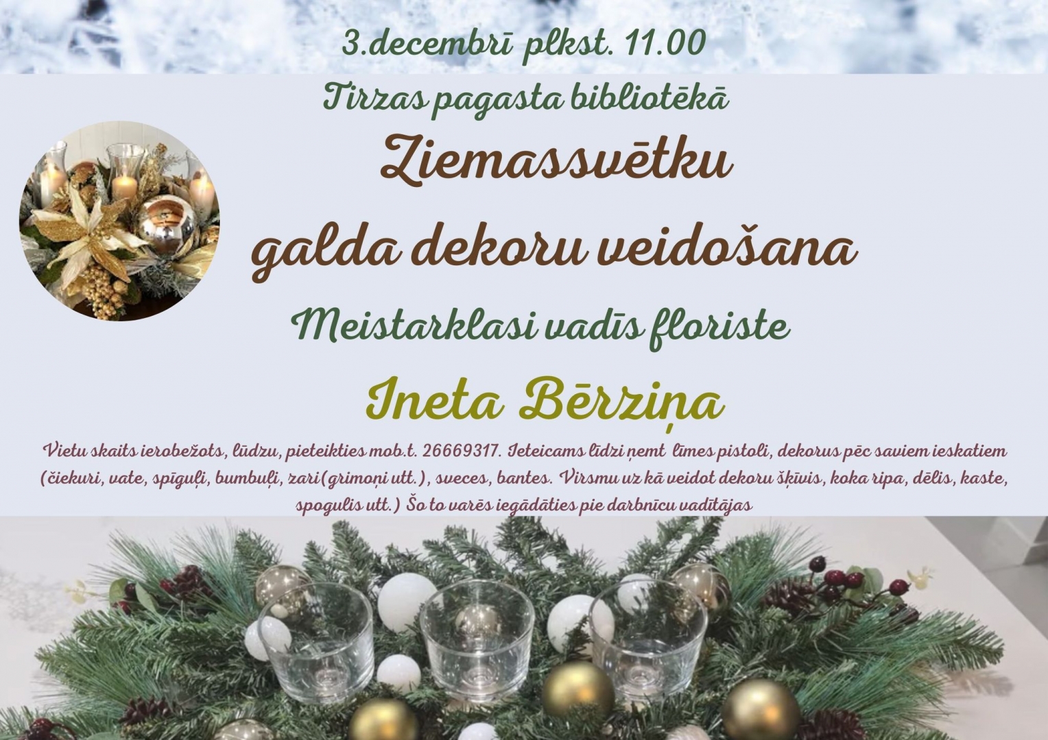 11:00 Tirzas pagasta bibliotēkā galda dekoru veidošanas darbnīca floristes Inetas Bērziņas vadībā