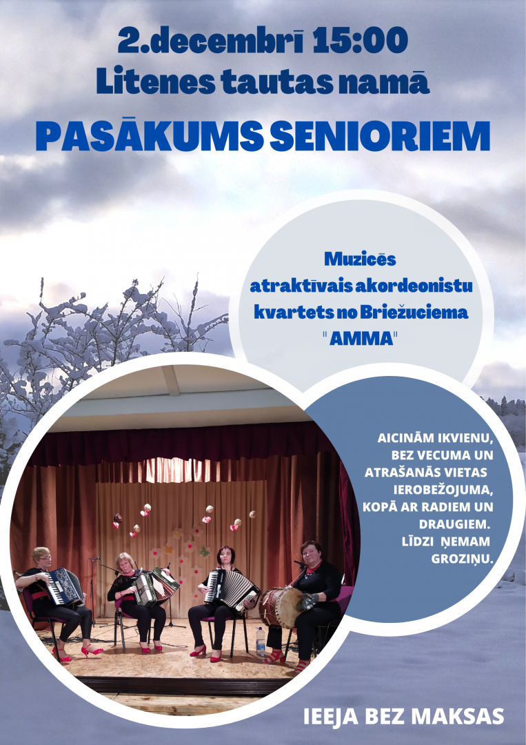 15:00 Litenes tautas namā pasākums kopā ar akordeonistu kvartetu no Briežuciema ‘’AMMA’’. Aicināti visu paaudžu apmeklētāji. Var ierasties ar groziņu. Ieeja bez maksas.