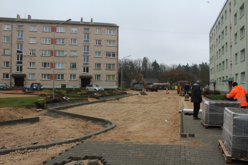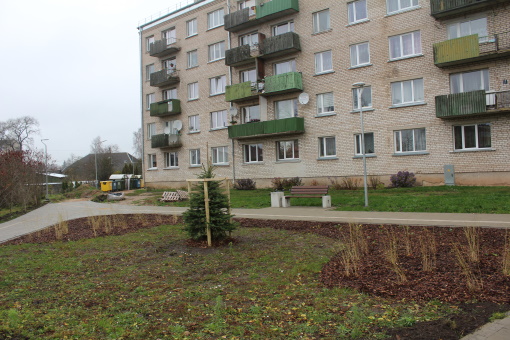 Šajā rudenī veikti darbi zaļajā zonā: iestādītā egle, jaunie kociņi un citi zaļumaugi. To iestādīšana netraucē otrās kārtas pamatdarbu izpildi.”