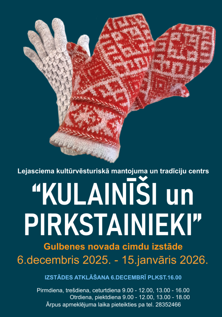 No 2025. gada 6. decembra līdz 2026. gada 15. janvārim Lejasciema kultūrvēsturiskā mantojuma un tradīciju centrā varēs apskatīt Gulbenes novada cimdu izstādi “Kulainīši un pirkstainieki”. Izstādes atklāšanas pasākums 2025. gada 6. decembrī plkst. 16.00.