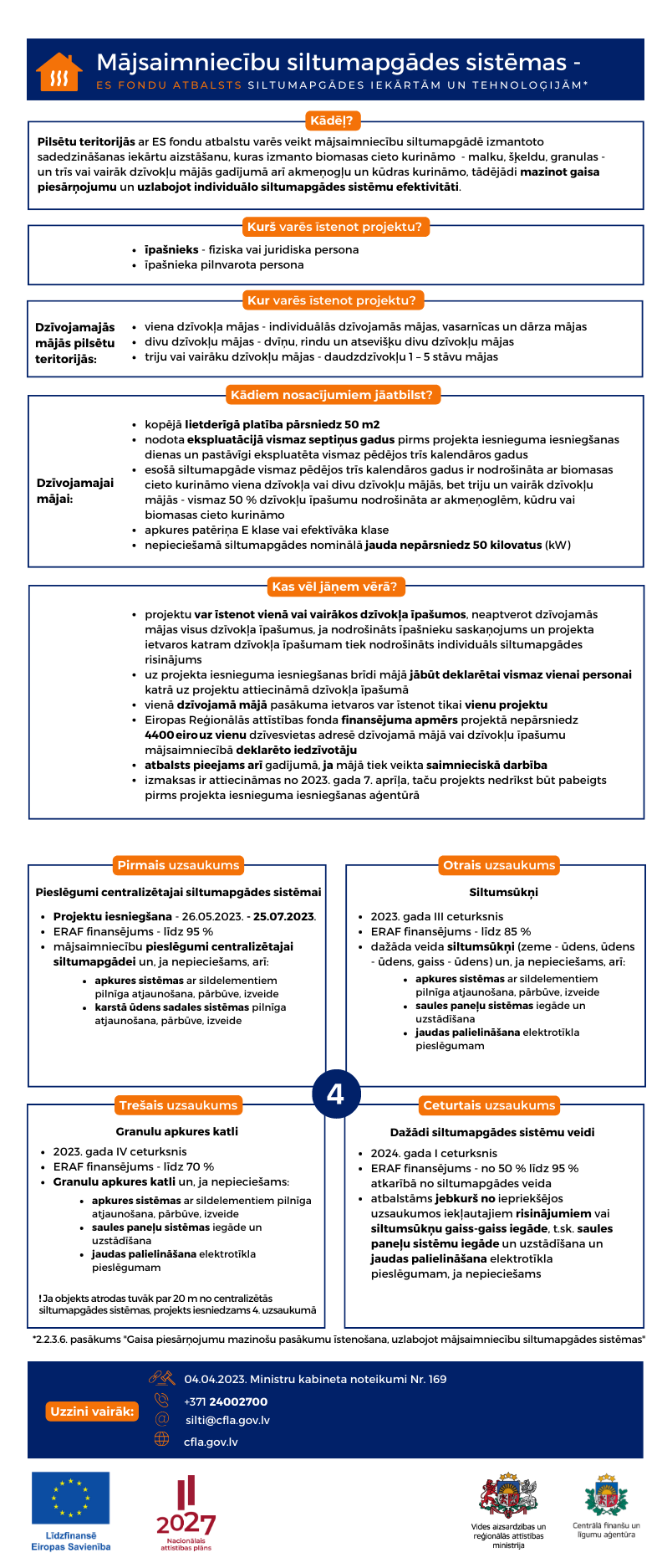 Vides aizsardzības un reģionālās attīstības ministrijas izstrādātā ES fondu programma veidota, lai samazinātu gaisa piesārņojuma radīto negatīvo ietekmi uz vidi un cilvēku veselību, veicot mājsaimniecību sektora dzīvojamās mājās siltumapgādē izmantoto sadedzināšanas iekārtu aizstāšanu, uzlabojot individuālo siltumapgādes sistēmu efektivitāti, ieviešot tehnoloģijas, kas būtiski samazina gaisa piesārņojumu, tai skaitā dzīvojamās mājas pieslēdzot efektīvām pilsētu centralizētajām siltumapgādes sistēmām.