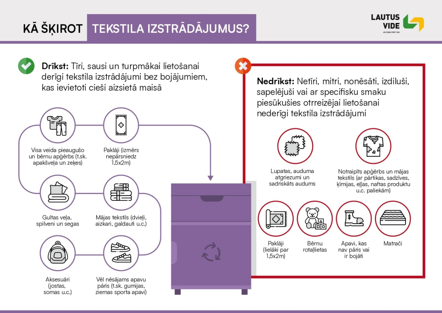 Atgādinām, ka EKO laukumā Gulbenē, 1. Maija ielā 6, privātpersonām, kurām ir noslēgts sadzīves atkritumu apsaimniekošanas līgums, ir iespēja bez maksas vienu reizi gadā nodot līdz 4 vieglo automobiļu riepām, kā arī tekstilizstrādājumu konteinerā var nodot nederīgu, bet tīru apģērbu, apavus un mājas tekstilu, piemēram, segu, dvieļus un gultas veļu. Tā ir lieliska iespēja atbrīvoties no nevajadzīgiem, bet vēl izmantojamiem tekstilizstrādājumiem, vienlaikus veicinot ilgtspējīgu atkritumu šķirošanu.