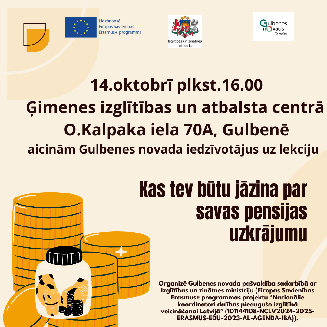 2025.gada 14.oktobrī plkst.16.00 Ģimenes izglītības un atbalsta centrā Gulbenes novada iedzīvotāji ir aicināti uz lekciju "Kas tev būtu jāzina par savas pensijas uzkrājumu".