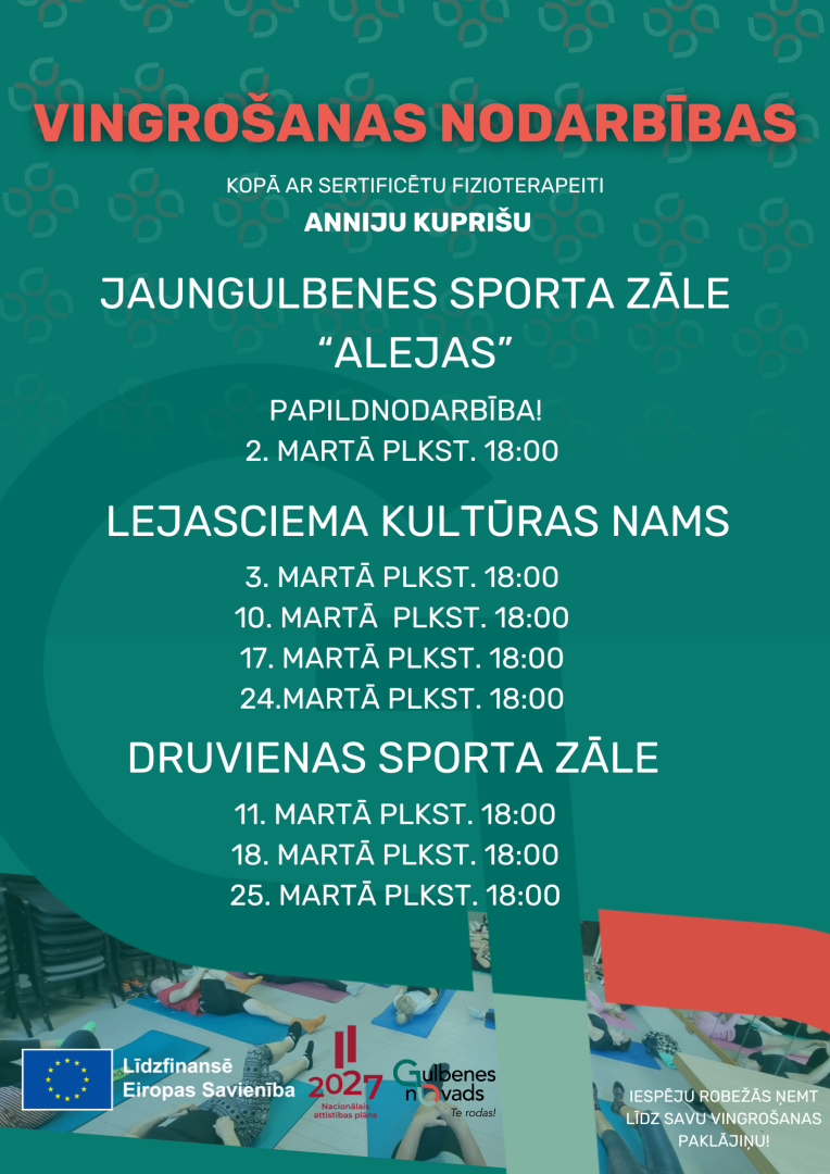 Bezmaksas vingrošanas nodarbības sertificētas fizioterapeites Annijas Kuprišas vadībā turpinās! Martā nodarbības plānotas Druvienā, tās atgriežas Lejasciemā un lielās atsaucības dēļ tiek organizēta papildnodarbība Jaungulbenē.