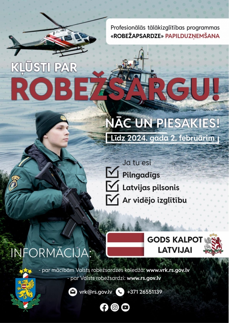 Uzņemšana Valsts robežsardzes koledžā notiek divas reizes gadā – vasarā un ziemā. Interesenti, kas nepaspēja pieteikties mācībām pamatuzņemšanas laikā, dokumentus var iesniegt līdz 2024.gada 2.februārim. Līdz ar to kļūt par robežsargu var ikviens Latvijas pilsonis ar vidējo izglītību vecumā no 18 līdz 40 gadiem.