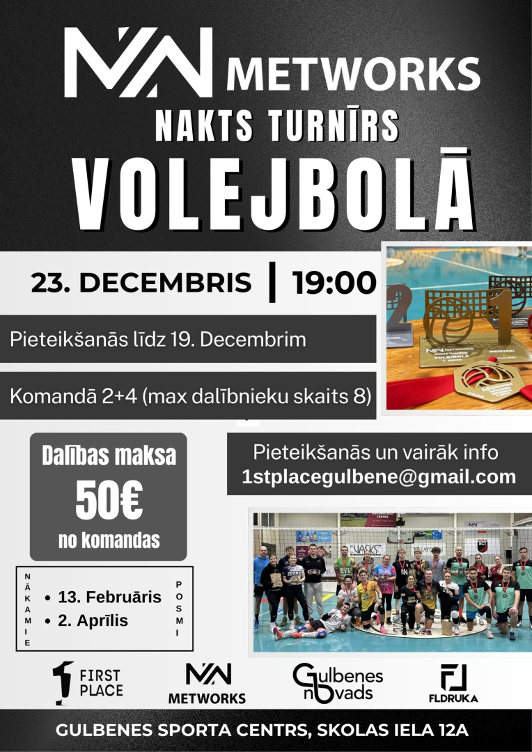 23.decembrī pl.19.00 Gulbenes sporta centrā un BJSS sporta zālē notiks "Metworks nakts turnīrs volejbolā", 3.posms. Pieteikšanās līdz 19.decembrim.