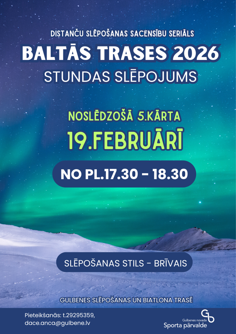 19.februārī pl.17.30 - 18.30 Gulbenes slēpošanas un biatlona trasē notiks distanču slēpošanas sacensību seriāla "Baltās trases 2026" 5.kārta. Stundas slēpojums. Slēpošanas stils - brīvais.